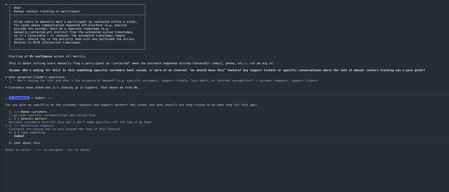 In addition to lots of helpful feedback over the past six months, Ben’s stroke of brilliance was to create a Claude Code skill he can talk to to figure out the SHIP score of a particular task.