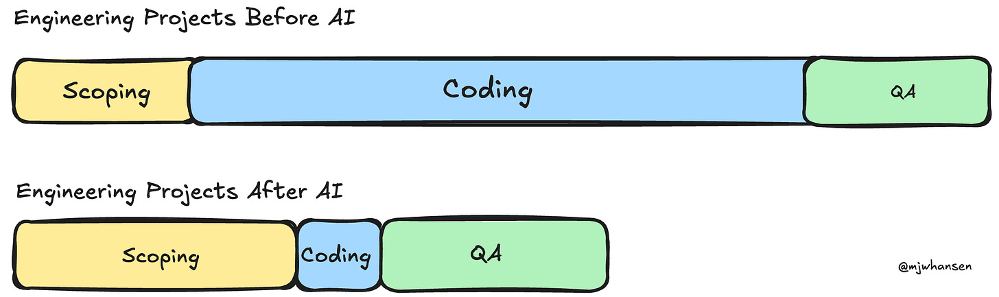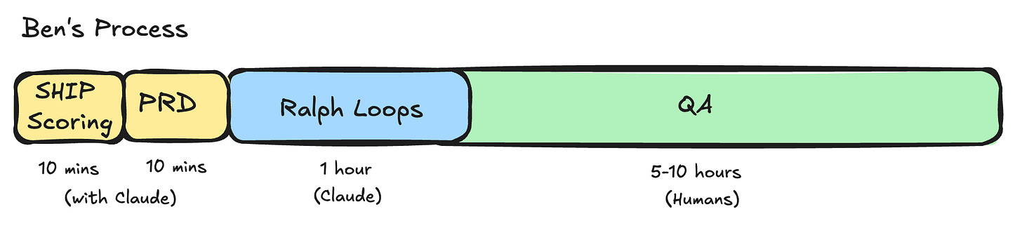 Now, there’s still time involved: lots of time writing product requirements documents for the Claude, and tons more time on QA (which is mostly manual). I included this illustration in a recent post for my company’s engineering blog:
